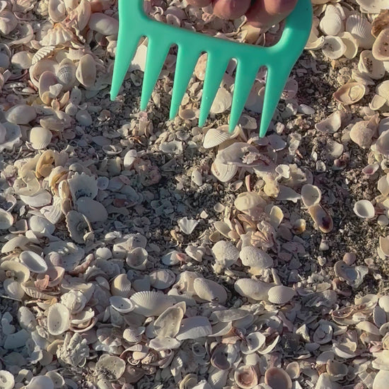 Constructed of solid molded nylon, our Mother Beach comb is light and durable, allowing your beach combing adventures to be more productive and enjoyable. Designed to fit comfortably in either hand, it reduces fatigue in your working hand, arm and shoulder. The sturdy teeth glide through pebbles and shells with ease, while protecting your nails and fingers. The compact size fits in a pocket and can be easily stored in your beach tote or backpack. It also fits perfectly into our Mother Beach wristlet! The bright turquoisé color celebrates our brand and makes it easy to spot in case you put it down along the way. Whether you are searching for sea glass, sharks teeth, shells or other hidden treasures, you won't want to be without this handy tool.